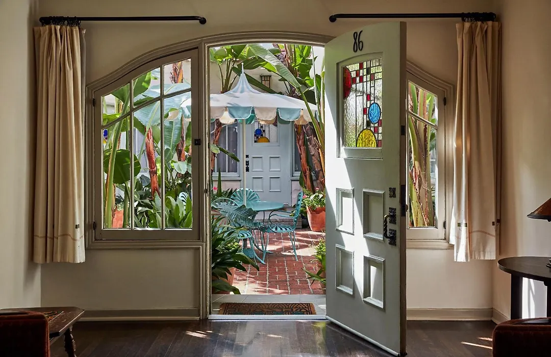 Leisure facilities feature a guest-only pool area with sun loungers, alongside a small fitness center. The hotel is known for its inviting gardens and proximity to popular hiking spots like Runyon Canyon Park, just a few kilometers away.