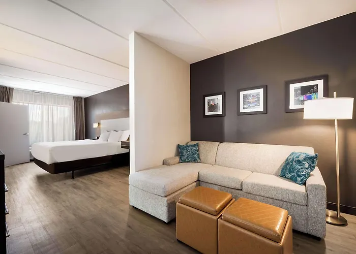 Leisure facilities include a fitness center and outdoor pool, perfect for relaxing after a busy day. Guests can engage in local activities at nearby Highland Creek Golf Club and Rocky River Golf Club, each offering golfing opportunities.