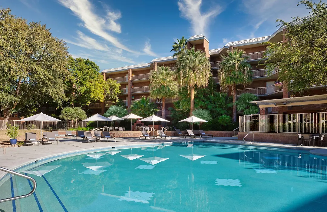 The hotel offers a fitness center, hot tub, and landscaped courtyard for relaxation. Nearby attractions include Golf N' Stuff Family Fun Center and Tucson Botanical Gardens, with recreational activities such as golf at Randolph North and Dell Urich Golf Courses.