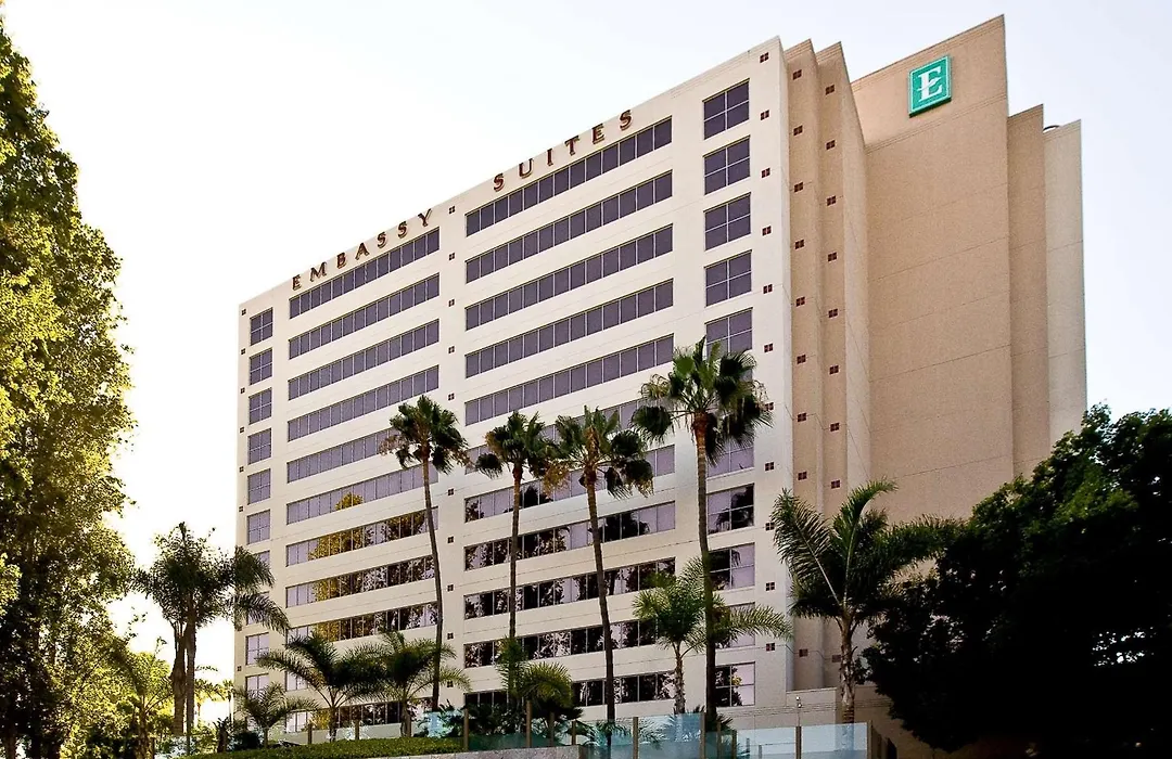 The Embassy Suites boasts 340 spacious accommodations with separate bedroom and living room areas, featuring a flat-screen TV, microwave, refrigerator, and a wet bar. Guests can benefit from amenities like laptop-compatible safes and complimentary newspapers.