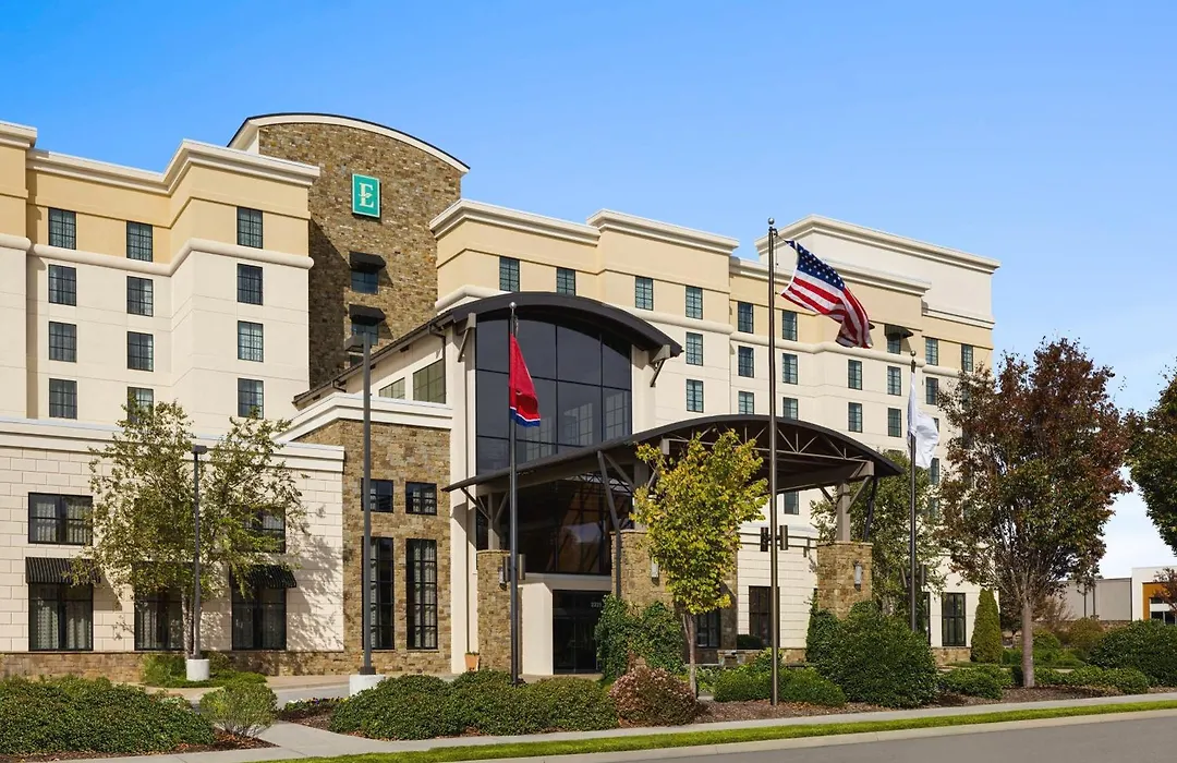 Embassy Suites Chattanooga Hamilton Place, a 4-star hotel with a 9.1/10 rating on Booking.com, features a wide indoor swimming pool and a rooftop terrace. Guests benefit from a complimentary made-to-order breakfast and a nightly manager's reception with beverages and appetizers.