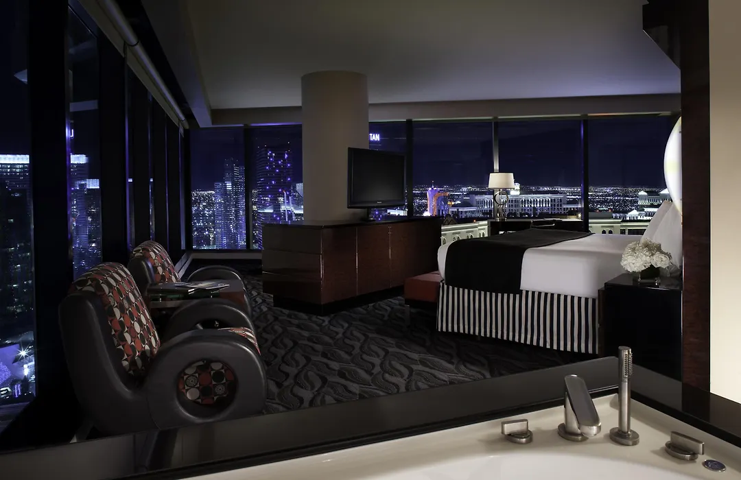 Rooms at Hilton Grand Vacations Club Elara Center Strip Las Vegas feature premium bedding, a flat-screen TV, and air conditioning. Most suites include kitchen facilities like a stovetop and refrigerator, providing flexibility for dining. Many rooms offer views of the Strip or mountains from floor-to-ceiling windows.