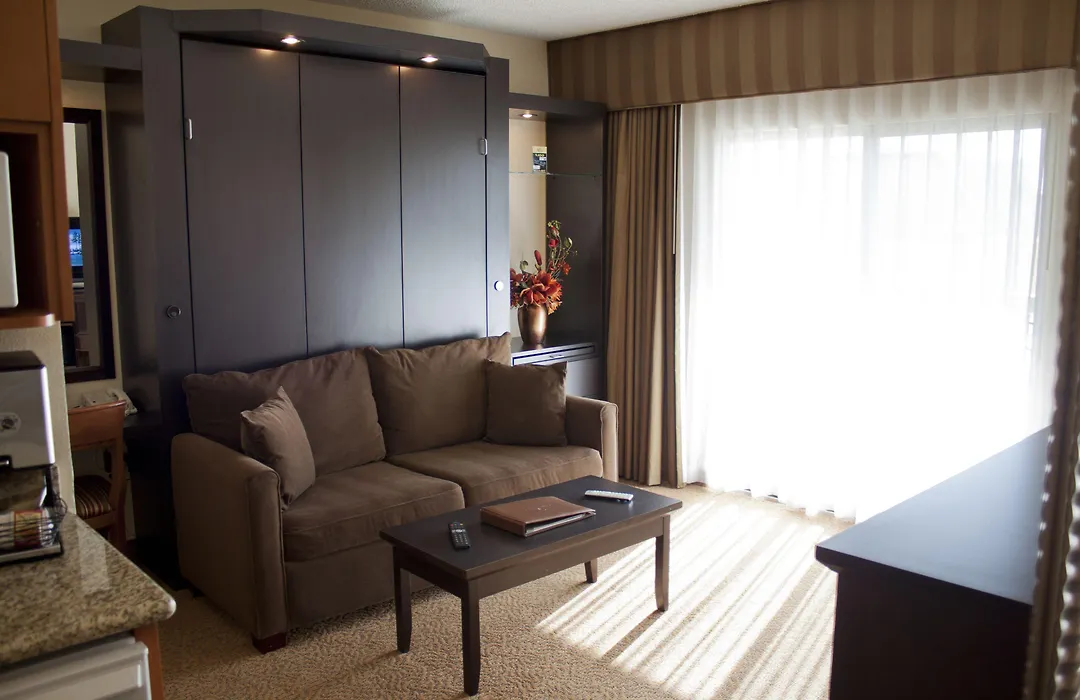 Rooms at Hilton Vacation Club Polo Towers Las Vegas feature spacious home-like suites, including full or partial kitchens, private bedrooms, and living areas. The 600-square-foot, one-bedroom accommodations provide amenities necessary for an extended stay.