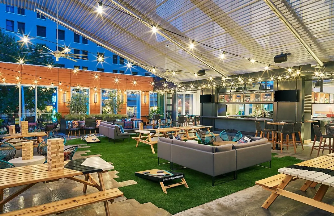 Dining options at Aloft Austin Downtown include Coffeehouse at Caroline for coffee and fresh-baked pastries, and Caroline Restaurant, serving traditional American cuisine with local touches. Upstairs at Caroline offers an open-air rooftop bar experience, featuring games like Jenga and foosball.
