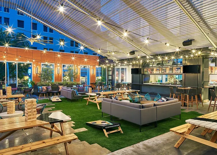 Aloft Austin Downtown is a 3-star hotel with a rating of 8.9/10 on Booking.com, featuring trendy accommodations and modern amenities. This pet-friendly hotel offers three on-site dining options and a fully equipped gym.