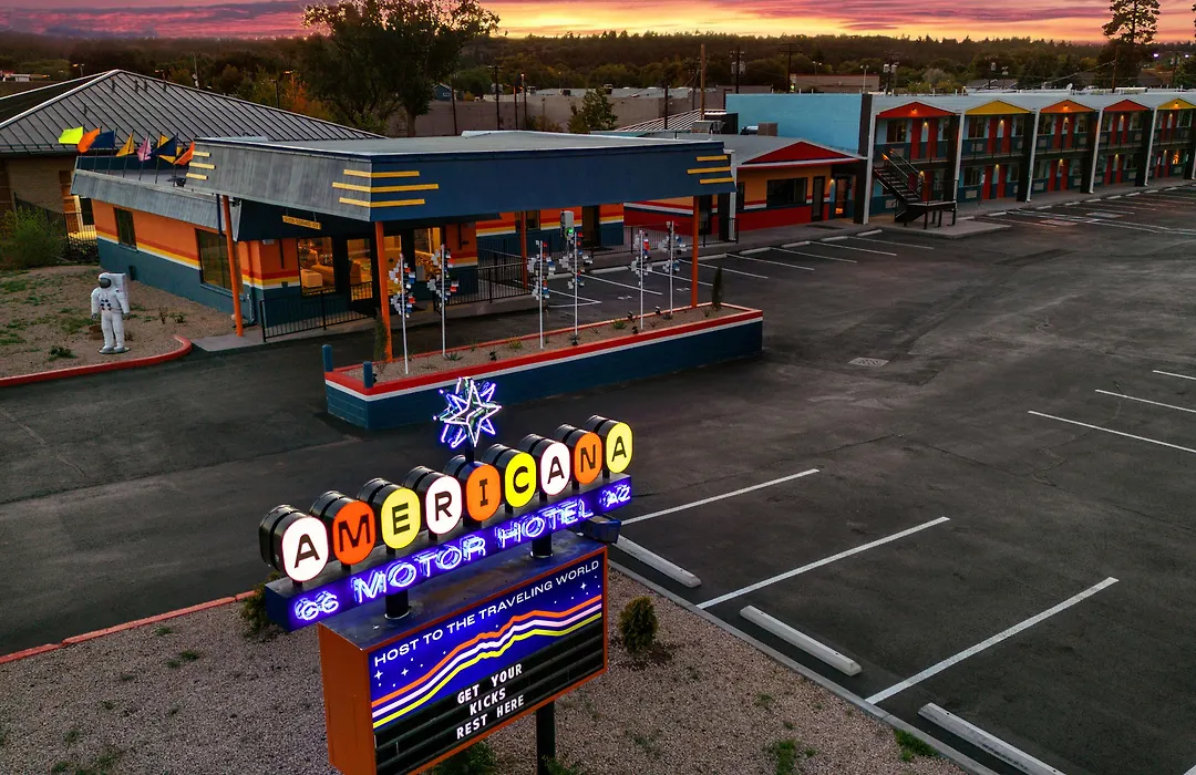 Americana Motor Hotel, a 4-star Flagstaff hotel with an 8.9/10 rating from Booking.com, features air-conditioned rooms equipped with modern amenities including free WiFi and private bathrooms. The hotel offers free parking, a terrace, and free bike rentals.