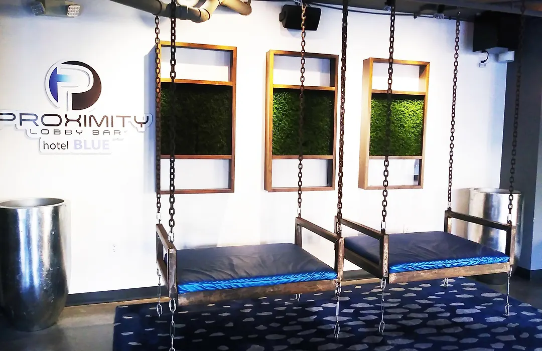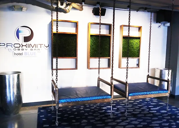 Dining options include Café Blue for light bites and Starbucks coffee, as well as seasonal offerings at the Proximity Lobby Bar. Guests also have access to dining at the Captain's Quarters, which includes the Loco Gecko restaurant serving burgers, pizzas, and more.