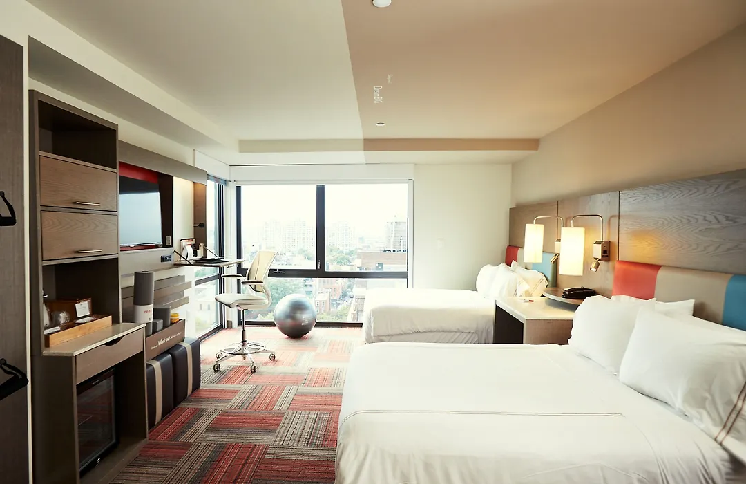 Rooms at Even Hotel Brooklyn By Ihg offer a modern design with natural light and amenities including flat-screen TVs and comfortable eucalyptus linens. The King Rooms include dedicated fitness zones, while Double Rooms with two queen beds cater to wellness-minded travelers with business areas and fitness features.