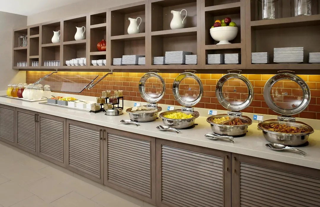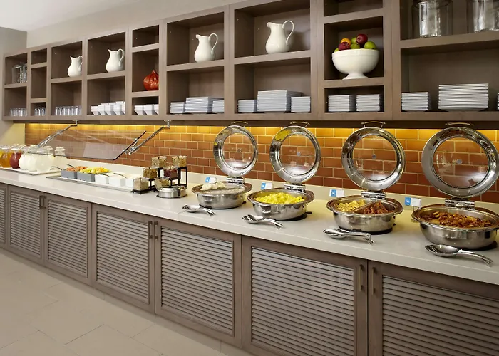 On-site dining includes HBAR, open evenings for cocktails and light snacks, as well as a complimentary buffet breakfast served on weekdays. Nearby dining options include The Cheesecake Factory and Qdoba Mexican Grill, both within 0.2 miles.