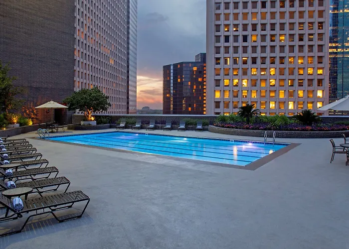 Hyatt Regency Houston Downtown is a 4-star hotel featuring a 350-foot atrium lobby, an outdoor heated pool, and various dining options. Guests can access a fitness center and business amenities 24/7. The hotel has a notable location linked by a skywalk to 26 blocks of downtown.