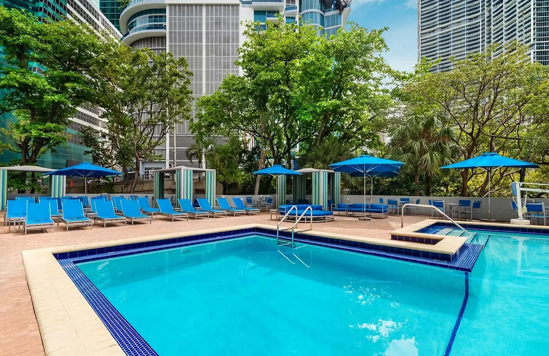 Leisure facilities include a fully equipped fitness center with cardiovascular equipment and a lounging pool area. Guests can explore nearby attractions such as the Port of Miami, 8 minutes' drive from the hotel, or enjoy amenities like the outdoor pool and terrace.