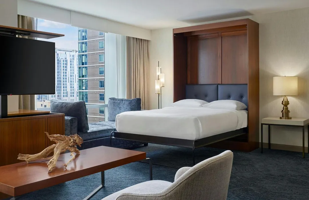 Guest rooms at JW Marriott Austin feature floor-to-ceiling windows, flat-screen TVs, and coffee machines. The hotel also includes 24-hour room service and digital check-in options.