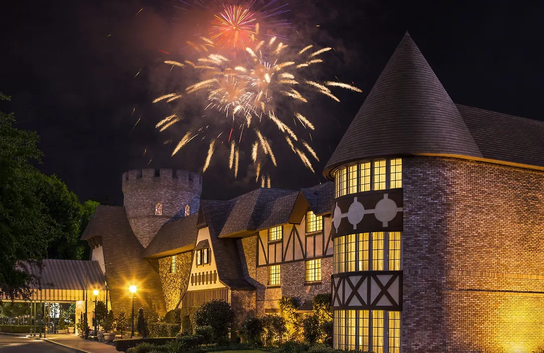 Rooms at Anaheim Majestic Garden Hotel are designed for comfort, featuring options such as Castle Bunk Rooms and Turret Suites that enhance the whimsical experience. Standard amenities include free Wi-Fi, 43' LCD TVs, mini-refrigerators, and private bathrooms with bathtub/shower combinations.
