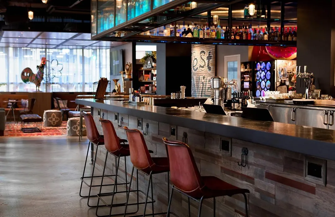 The hotel offers a breakfast bar featuring fresh bagels, fruit, and hot breakfast Naans. Guests can enjoy craft cocktails and local beers at the bar open 24 hours a day, alongside a small menu of heated food.