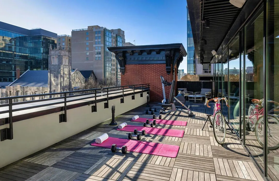 Guests can unwind in the open lobby equipped with board games and cozy seating. The fitness center includes a Peloton bike and is connected to a private outdoor terrace for yoga or relaxation.