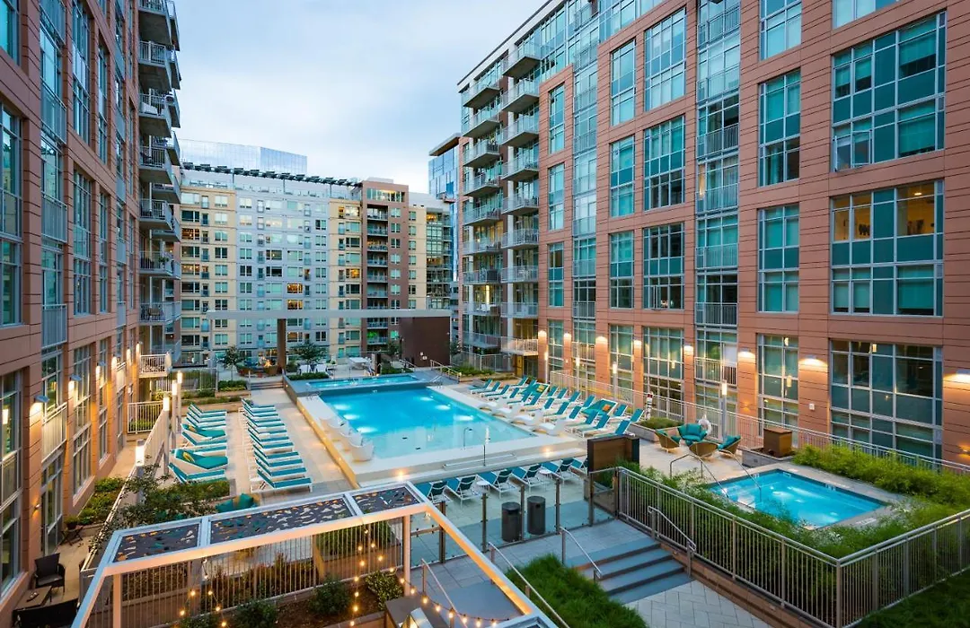 Leisure amenities include the rooftop pool and hot tub, providing guests with a space for relaxation. The fitness center is available for those looking to maintain their fitness routine during their stay.