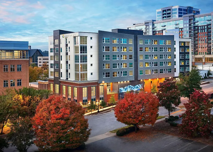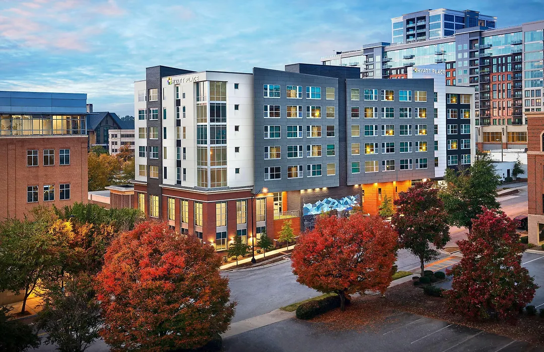 Hyatt Place Greenville Downtown is a 3-star hotel rated 8.8/10 on Booking.com. The property features an indoor pool, a cozy bar, and a 24-hour fitness center, along with modern dining options and a complimentary Full Hot Breakfast.