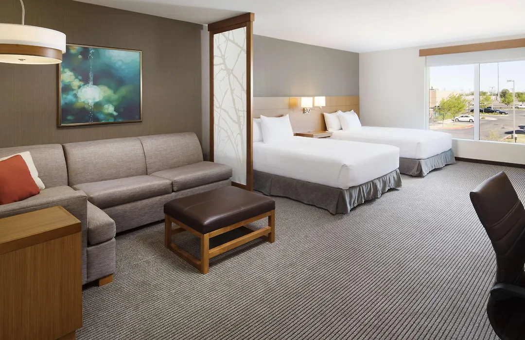 Guest rooms at Hyatt Place Lubbock include refrigerators, coffee machines, and flat-screen TVs with premium channels. Private bathrooms feature showers and complimentary toiletries. The hotel offers free WiFi and wired internet access in each room.
