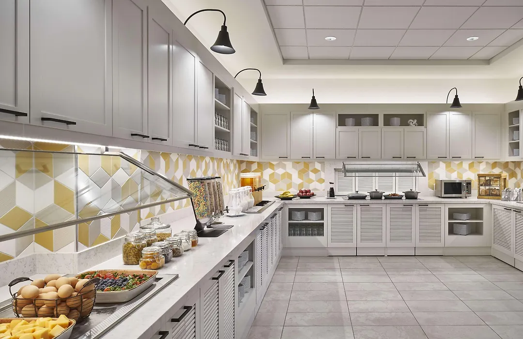 Dining options feature The Bar, offering regionally inspired food and specialty coffee drinks. A complimentary buffet breakfast is served on weekdays, while The Market provides grab-and-go items including snacks and salads.