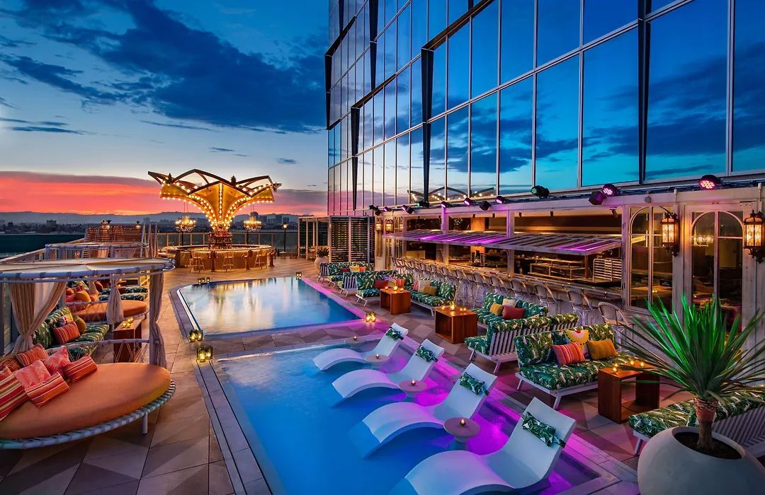 Moxy Downtown Los Angeles, rated 7.8/10, offers a rooftop bar on the 34th floor with views to the Hollywood Hills, alongside an outdoor swimming pool and fitness center. This 4-star hotel features a collection of restaurants and bars, showcasing diverse cuisines in the creative epicenter of LA.