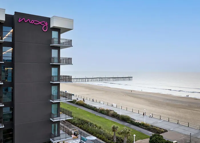 Moxy Virginia Beach Oceanfront is a chic 2-star hotel rated 8.1/10 on Booking.com, situated on Virginia Beach Boardwalk. This stylish property offers modern amenities including free Wi-Fi, an outdoor swimming pool, and a full-service bar.