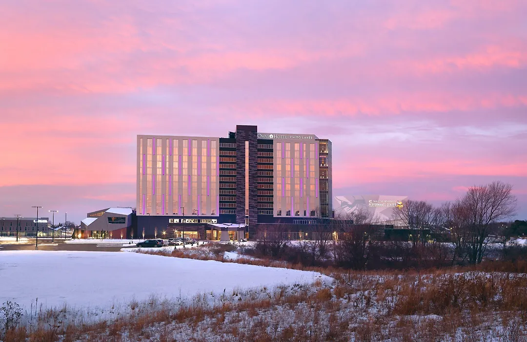 The Omni Viking Lakes features 320 guest rooms and suites designed with Nordic influences. Premier rooms include floor-to-ceiling windows offering views of the Viking Lakes practice facility and the Eagan skyline.