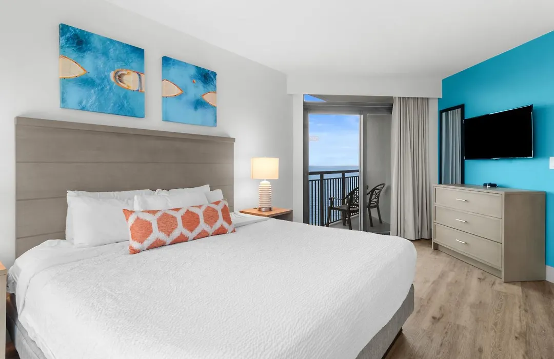 The accommodations at Caribbean Resort Myrtle Beach include a variety of condos ranging from one to four bedrooms, ideal for families or larger groups. Each unit comes with modern conveniences like fully equipped kitchens and private balconies offering ocean views.