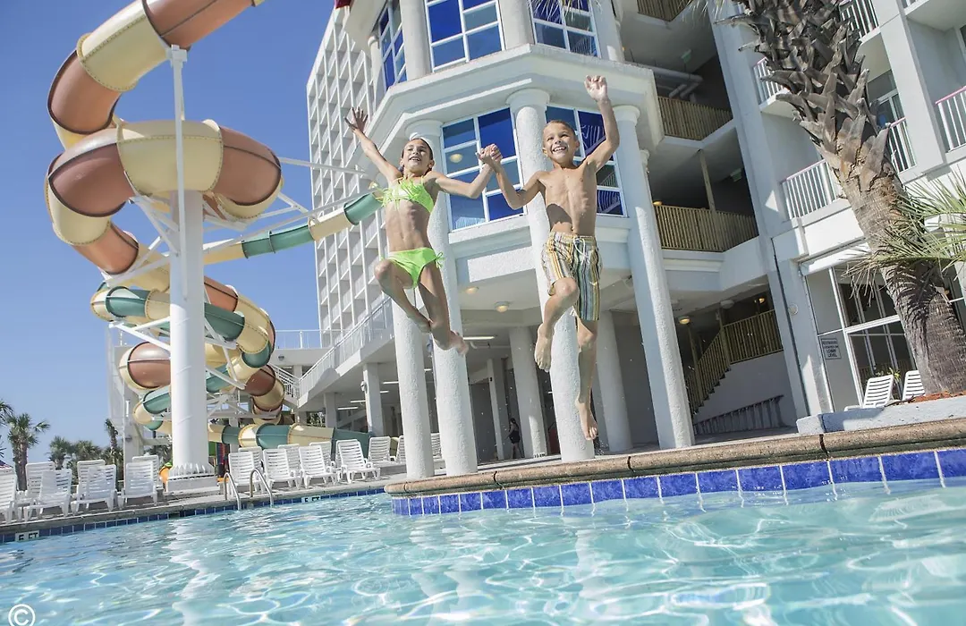 Crown Reef Beach Resort And Waterpark features over 15 water amenities including a large lazy river, outdoor pools, and hot tubs, ensuring outdoor enjoyment for families. The expansive waterpark includes two giant waterslides and a kids' play area.