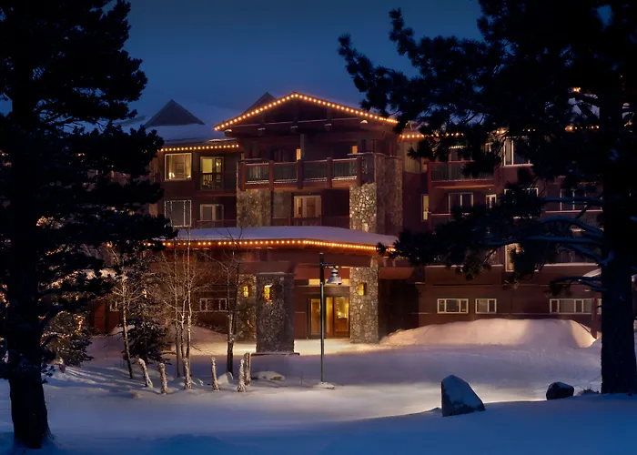 Juniper Springs Resort, a 4-star Mammoth Lakes hotel with an 8.4/10 Booking.com rating, offers ski-in, ski-out access with amenities like a heated pool, outdoor hot tubs, and a fitness center. Each unit features a fully equipped kitchen and a gas fireplace.