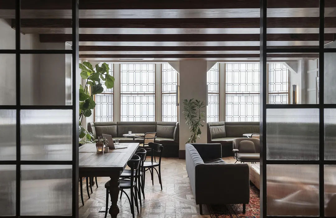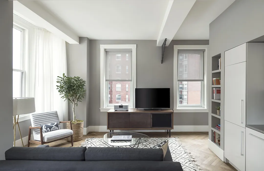 Roost Rittenhouse provides studio, one, and two-bedroom apartments, each featuring herringbone wood floors, large factory-style windows, and custom artwork. The apartments include Bosch appliances, ample workspace, and in-unit washer & dryers.