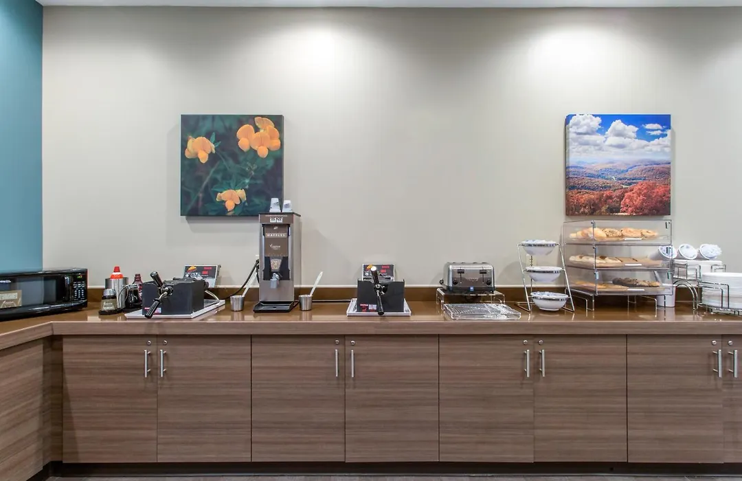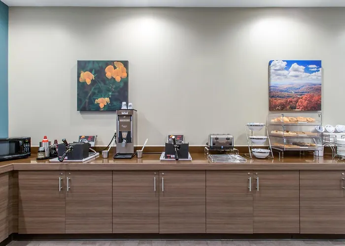 The hotel serves a free full hot breakfast on weekdays from 5:30 AM to 9:30 AM, with extended hours on weekends and holidays. Nearby dining options include Storm King Tavern and Okaeri Sushi Hibachi.