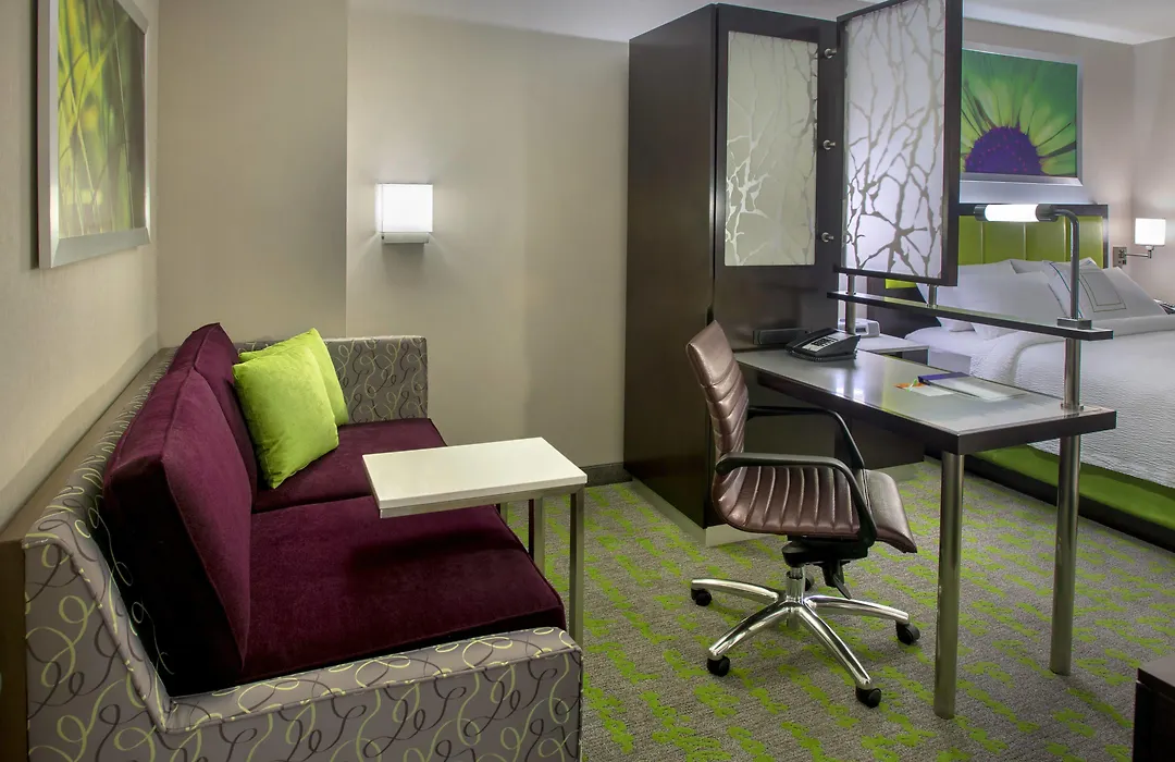 The SpringHill Suites features spacious suites equipped with ergonomic work desks, plush bedding, and free Wi-Fi. Each room includes modern conveniences like laptop-compatible safes, air conditioning, and flat-screen TVs. A poem by Robert Frost is printed on the bathroom wallpaper, adding an artistic touch to the stay.