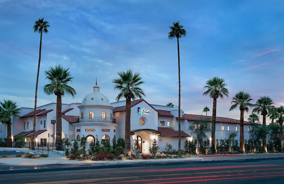 Triada Palm Springs, Autograph Collection is a luxury boutique hotel featuring 56 rooms, two refreshing pools, a spa, fitness center, and an intimate restaurant. This 4-star Palm Springs hotel showcases a hacienda-style layout with three distinct wings, offering a blend of modern amenities and Hollywood nostalgia.