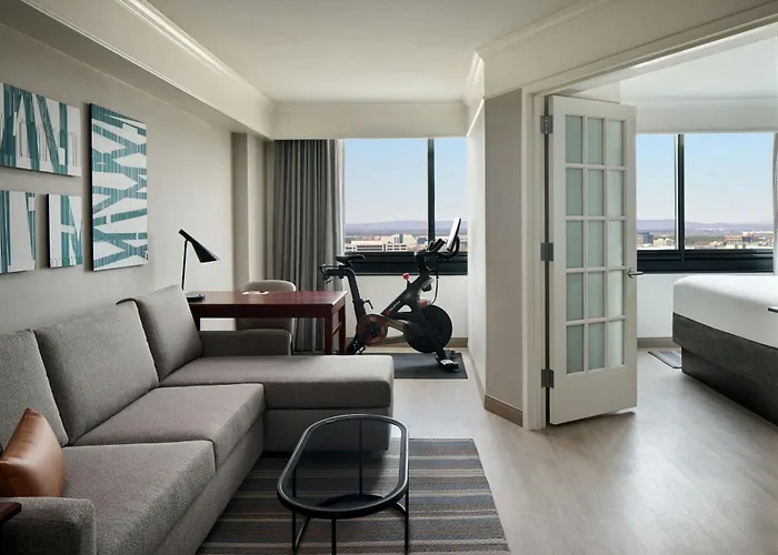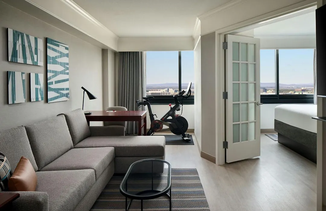 Each suite at Washington Dulles Marriott Suites includes a wet bar, mini-refrigerator, and separate living area, providing ample space for guests. The hotel offers high-speed Wi-Fi, smart TVs with access to Netflix and Hulu, and deluxe Marriott bedding.